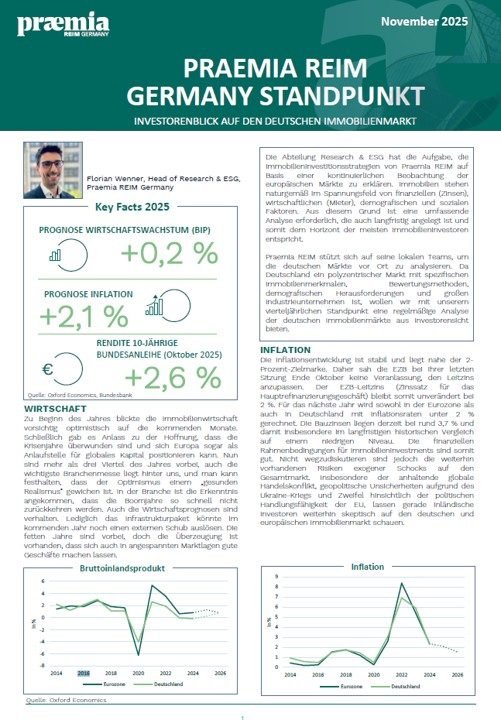 Praemia REIM in Germany has its own Research-Team, which analyzes the German real estate market at regular intervals and issues forecasts. The quarterly STANDPUNKT provides investors with an analysis of specific asset classes in the current context of financial, economic, demographic and social factors. In addition, the research team publishes specific reports, such as an analysis of the office property market, to keep investors up to date on changes in the German real estate markets.